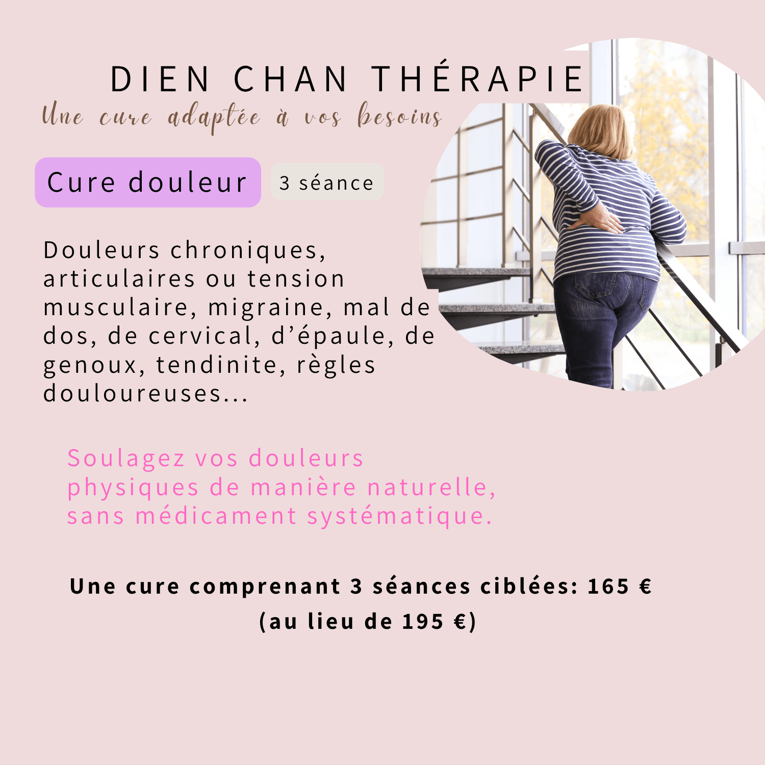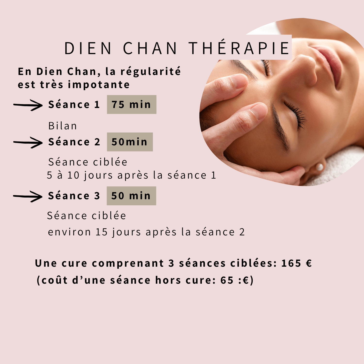 Le Dien Chan est une méthode douce et innovante qui stimule des points précis du visage pour rééquilibrer le corps dans sa globalité. En activant ces points réflexes, le Dien Chan permet de soulager la douleur, réduire les symptômes et stimuler les mécanismes naturels d’auto-guérison. Ce procédé réveille et fait circuler l’énergie vitale, aidant ainsi les organes à retrouver naturellement leur équilibre et leur bon fonctionnement, sans danger ni intervention invasive.